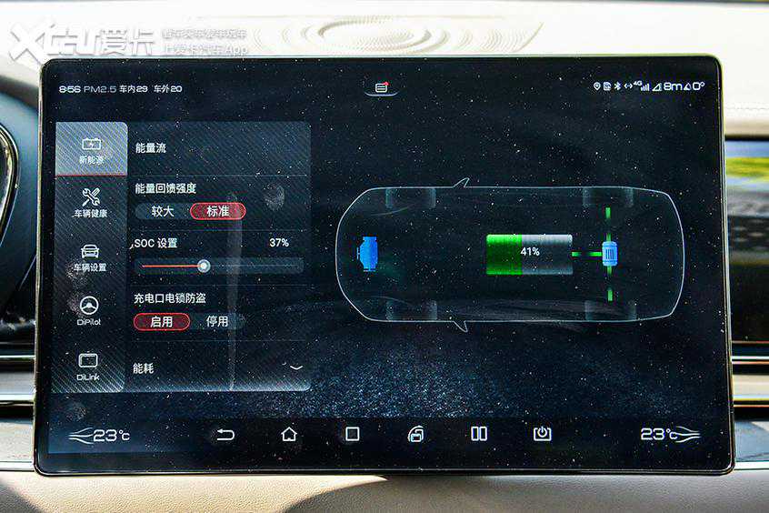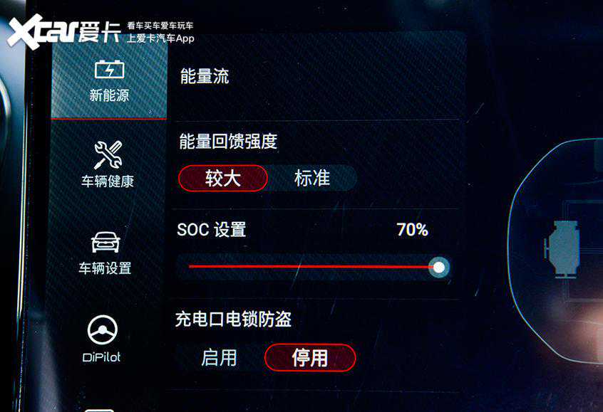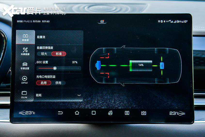汉DM可以通过中控系统的新能源模块,进行SOC设置,这项功能是调节电池保电量的,简单点说,SOC将决定发动机工作时,是否需要额外为电池充电。