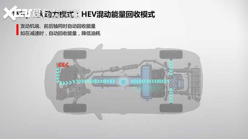 3、HEV混动串联模式(可以理解为目前市场上的增程式),原则上动力输出其实还是和EV纯电模式一样,由电池供电驱动电机驱动。不同的是发动机此时会进行发电,增强了保电能力,能让纯电模式的续航里程增加也能让发动机的效能更高,算是混合动力车型中能耗最低的模式之一了。