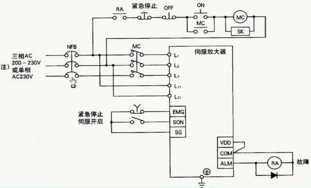 图中输入的是三相电源或者是单相电源,NFB表示空气开关,在空气开关出来以后,我们都可以看出它分为两路,一路是直接进入控制电源,L11和L21,L3,一路通过MC也就是交流接触器进入主电源,那么由于这里采用了交流接触器,因此我们还需要一个对交流接触器进行控制的回路,所以最上面的线路主要是对交流接触器进行控制的回路,EMG为急停按钮要求在伺服放大器工作的时候保持常闭,SON是伺服开启,我们要使伺服放大器工作的时候就需要把这个开关合上