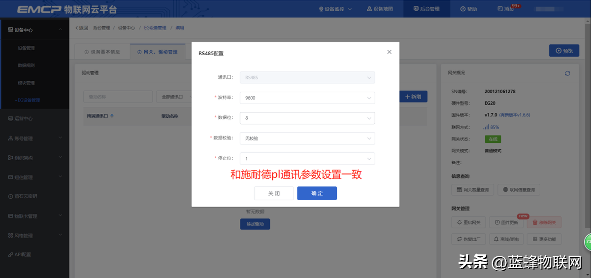 远程配置最主要两个地方需要配置,一是配置网关485通讯参数,二是在平台上创建施耐德PLCmodbus-RTU的设备驱动,下面分步骤对此功能进行讲解。注:网关只有在线后才可以进行远程配置。