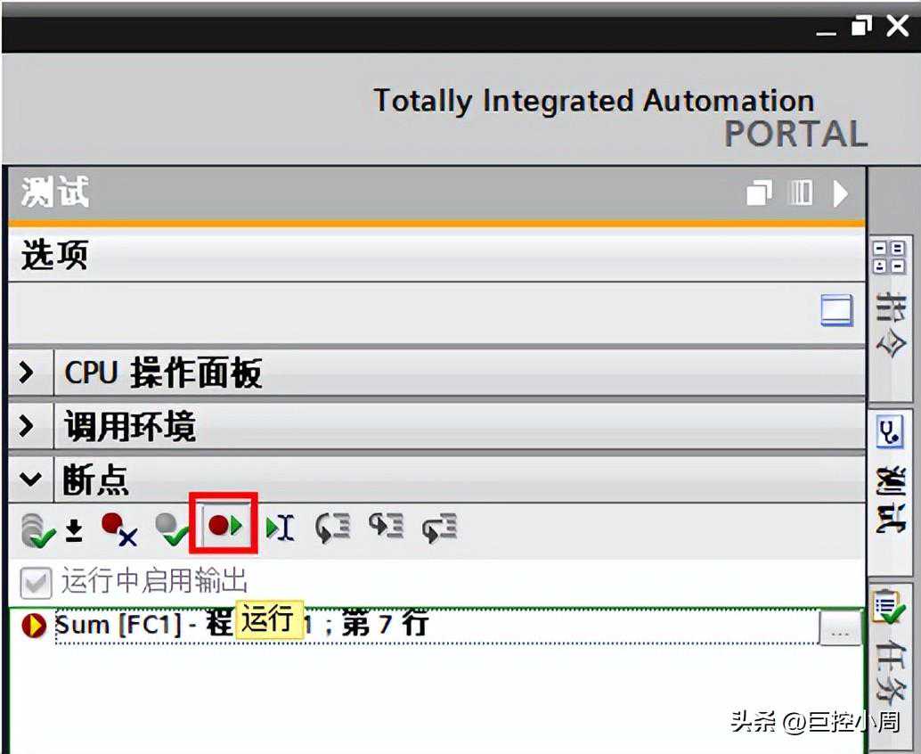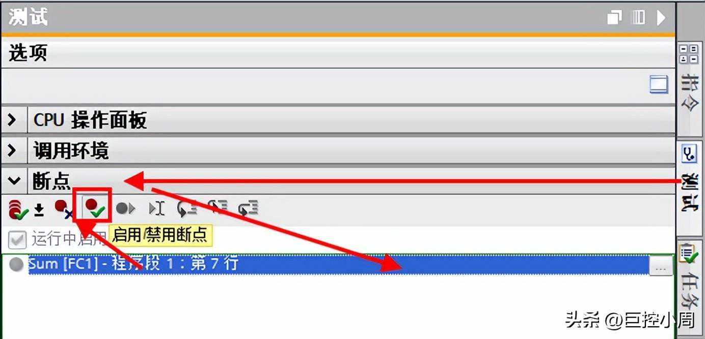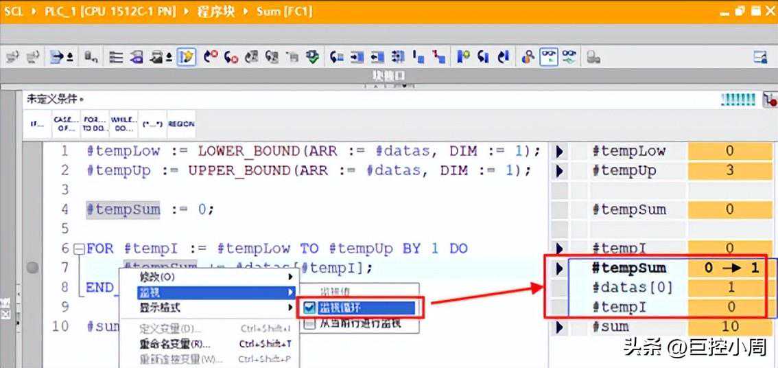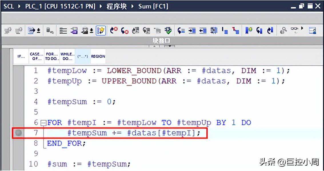 有高级语言开发经验的人知道,此时应该使用断点调试功能来解决。是的,S7-1500从TIAPortalV15,固件版本开始支持SCL的断点调试。有了这个功能,就可以非常方便地调试循环内的程序执行情况。具体步骤: