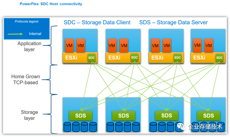 传统的PowerFlex块存储访问如上图,在每一台应用服务器上运行SDCagent客户端,来访问SDS存储节点,中间的网络是基于TCP的。SDC支持的操作系统包括VMwareESXi、Windows、AIX和众多Linux发行版。如果SDC和SDS部署在同一个物理服务器上,那样就是HCI超融合的形态。