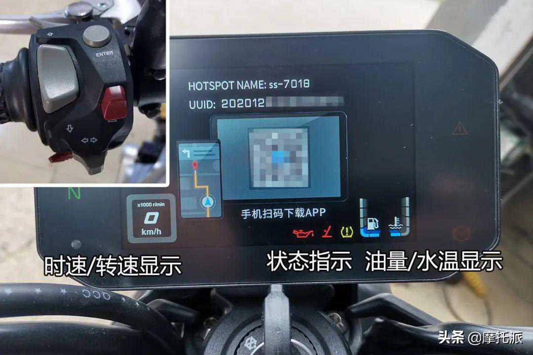 通过短按左手把开关组上的“ENTER”键,可以进入投屏导航的连接准备界面。使用手机扫码安装一款专用APP,然后将热点打开,简单设置后就可以进行导航地图信息的投屏。