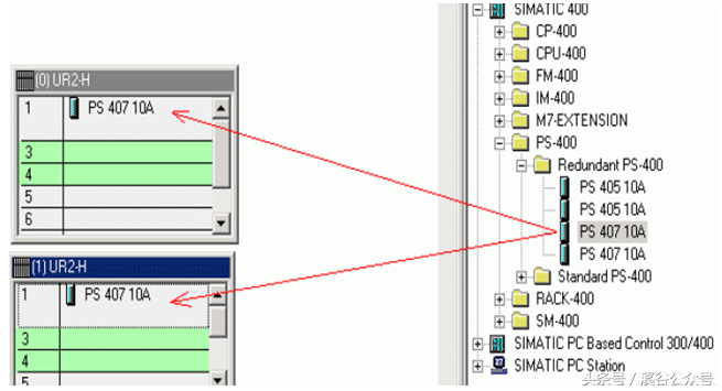 ►分别在两个机架中添加PS407电源模块,路径为:SIMATIC400PS-400PS40710A(6ES7407-0KR02-0AA0)。