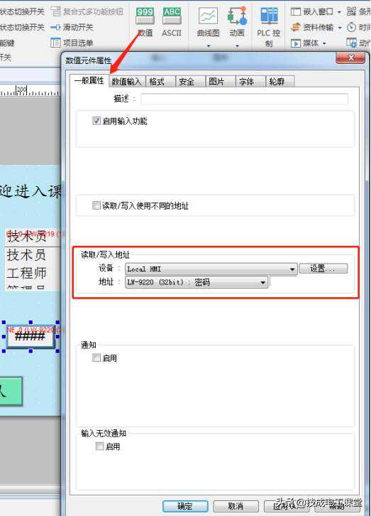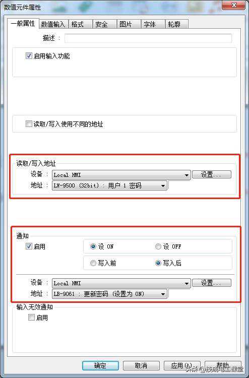 2.使用数显来修改密码,读取和写入地址选择LW—9501用户密码2也就是修改对应工程师密码,勾选通知,设ON,写入后,系统寄存器地址LB—9061更新密码(设置为ON)
