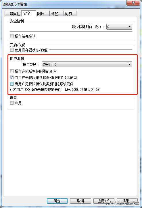 安全:用户限制—操作类别选择类别C,勾选当用户无权限操作此类别时弹出提示窗口。