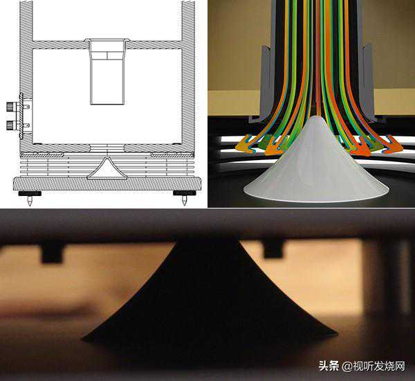 再一个特殊的技术跟低音反射孔有关。Fyne采用向下开口的低音反射设计,这个不稀奇,很多厂家都这么做。然而,Fyne在低音反射孔开口处,配合底板的夹层,加装一个锥状的导流器,这样,就能使低音能量均匀地朝360度方向发散,而不至于直接撞击地面而造成反射。这个技术,称为BassTrax。