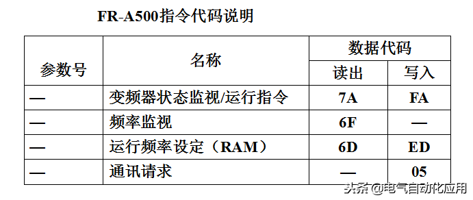 指令代码是由PLC发给变频器,指明程序要求(例如运行、监视等)。通过相应的指令代码,变频器可进行各种方式的运行和监视。