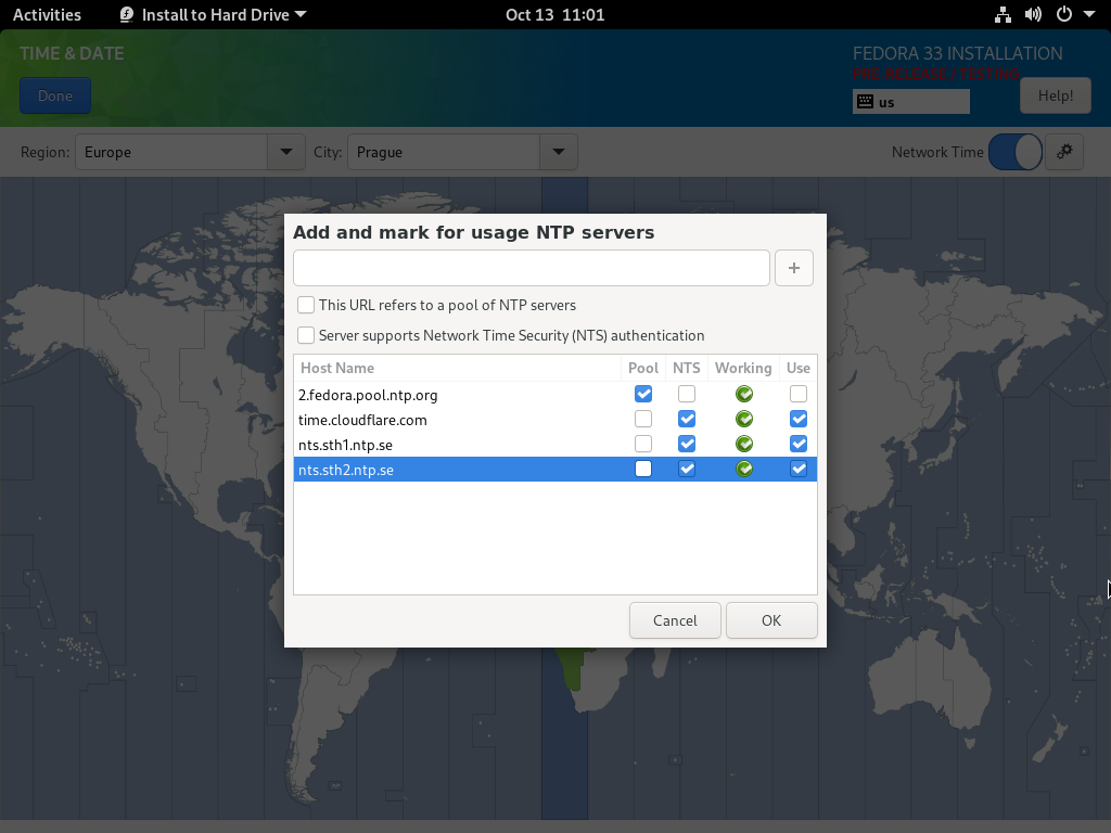 Fedora33Beta安装程序包含一个较旧的Chrony预发布版本,它不能与当前的NTS服务器一起工作,因为NTS-KE端口已经改变。因此,在安装程序中的网络时间配置中,服务器总是显示为不工作。安装后,需要更新chrony包,才能与当前的服务器配合使用。↩︎