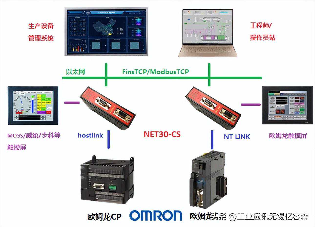 将桥接器NET30-CS的通讯口COM1连接到CP1W-CIF01,桥接器的通讯口COM2口,连接到MCGS的触摸屏,桥接器的以太网口连接到上位采集系统的网络中。