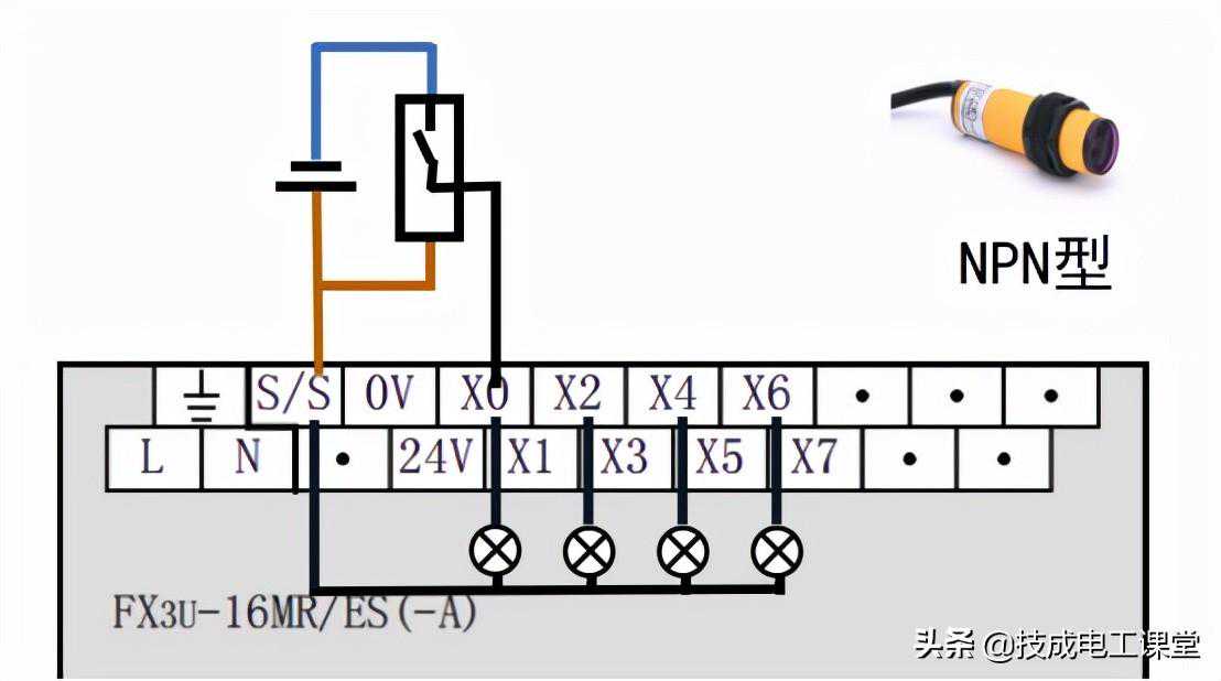 以三菱FX3UPLC为例。为了方便理解,我们可以把PLC的输入端X点内部想像成连接着一个灯泡。灯泡另外一端全部并在公共端S/S。