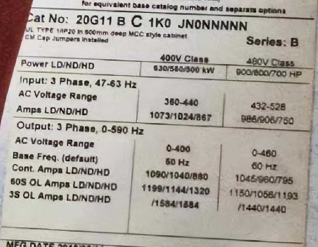 变频器类型为PowerFlex755,400VAC/540VDC电压等级,额定电流1040A,重载应用电流880A,框架号9,防护等级IP20。过载能力:150重载应用电流60S。三、汇川产品选型