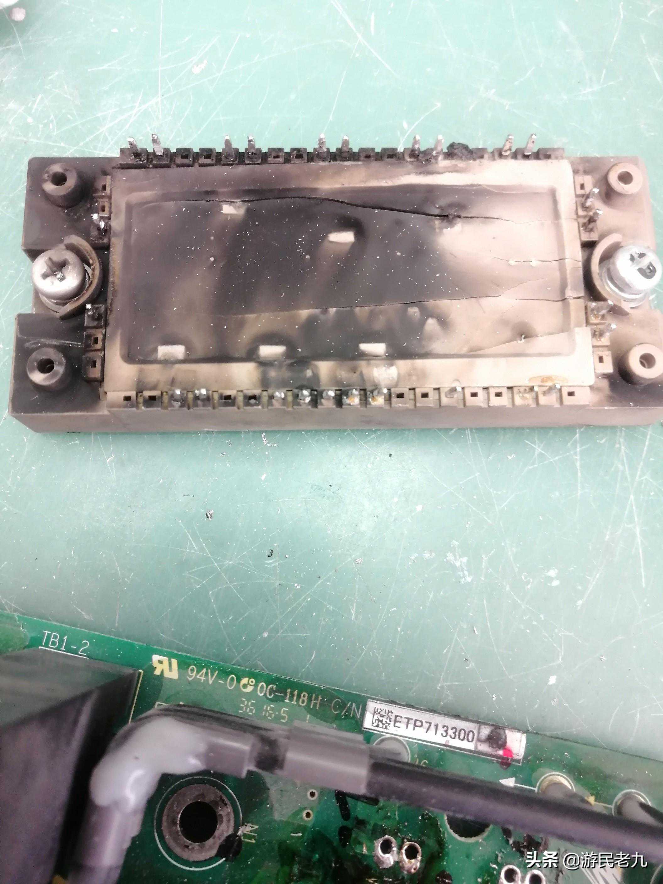 于是拆机,发现驱动板已经炸黑了一大片。仔细查看,模块出还有两个管脚炸出了小洞,于是先焊下模块,清理板子,发现应该还可以用。