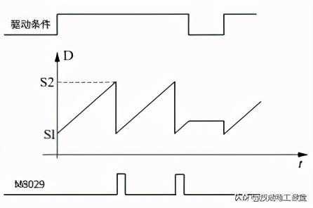重复模式的执行,是基于M8026=ON且驱动条件成立的情况下的,若在驱动条件断开,D的值将保持在当前值不变,直到下一次驱动条件的在此接通,D的值又会重新从S1开始变化。而每一次的斜坡结束(即D的值等于S2的值),M8029结束标志位都会导通一个周期。