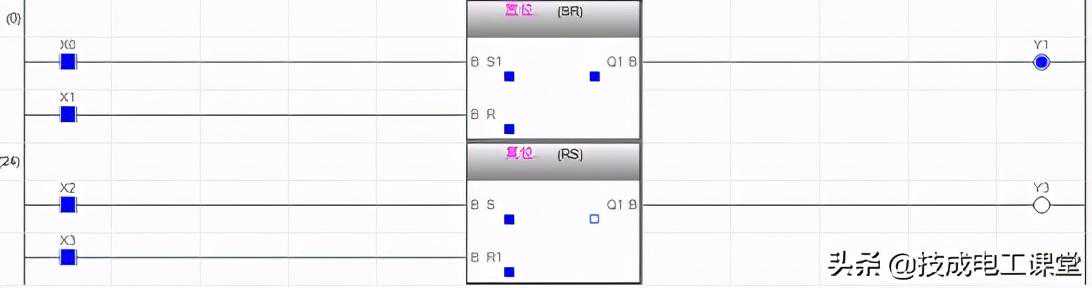 举个最简单的程序例子,我们可以用置位优先和复位指令实现单按钮控制启停功能。