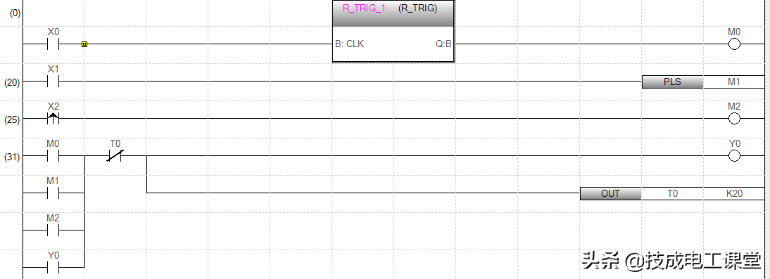 其实这两个指令也很简单,上升沿边缘检测功能块R_TRIG与PLS、LDP指令功能是一样的,下降沿边缘检测功能块F_TRIG与PLF、LDF指令功能是一样的,我们看下图的程序,接通X0和接通X1,接通X2实现的效果是一样的。