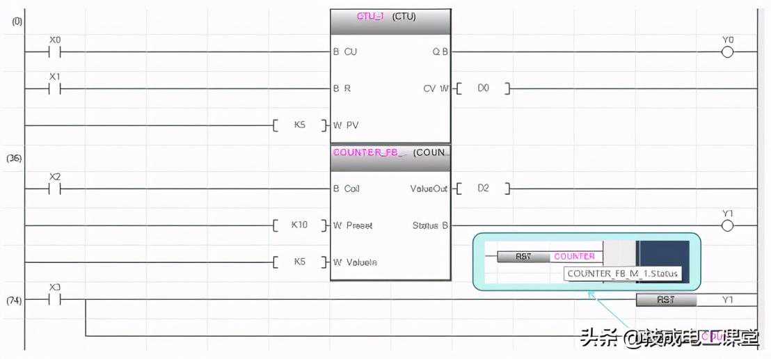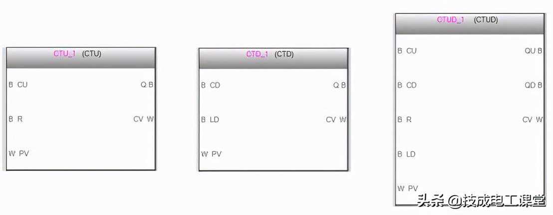 CTU/CTD/CTUD功能块管脚定义:CU是加计数脉冲输入,CD是减计数脉冲输入;