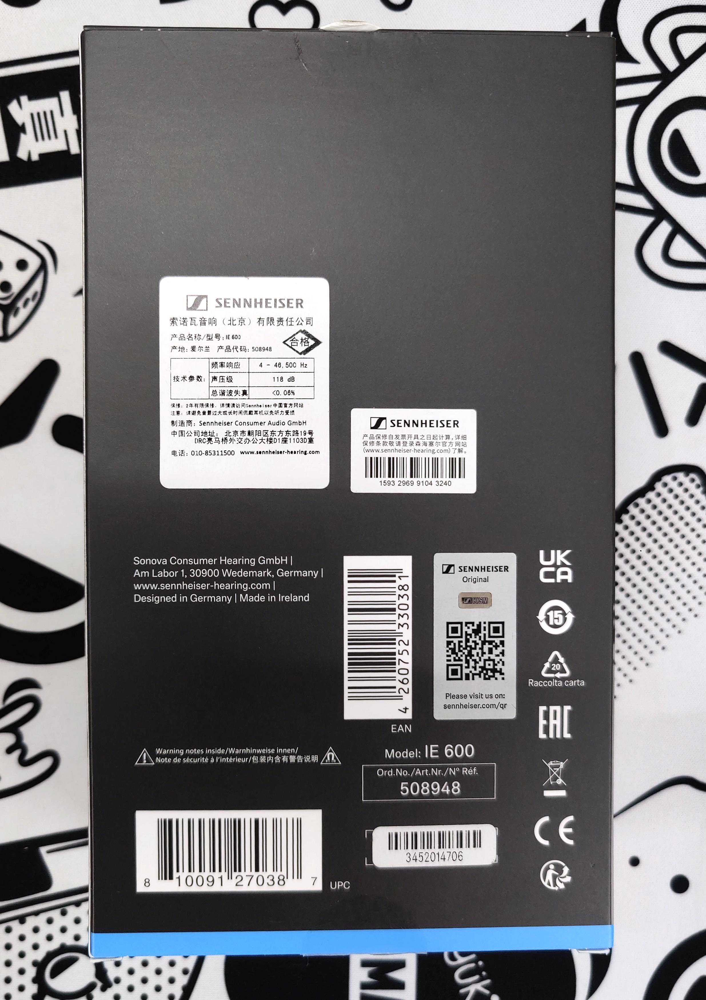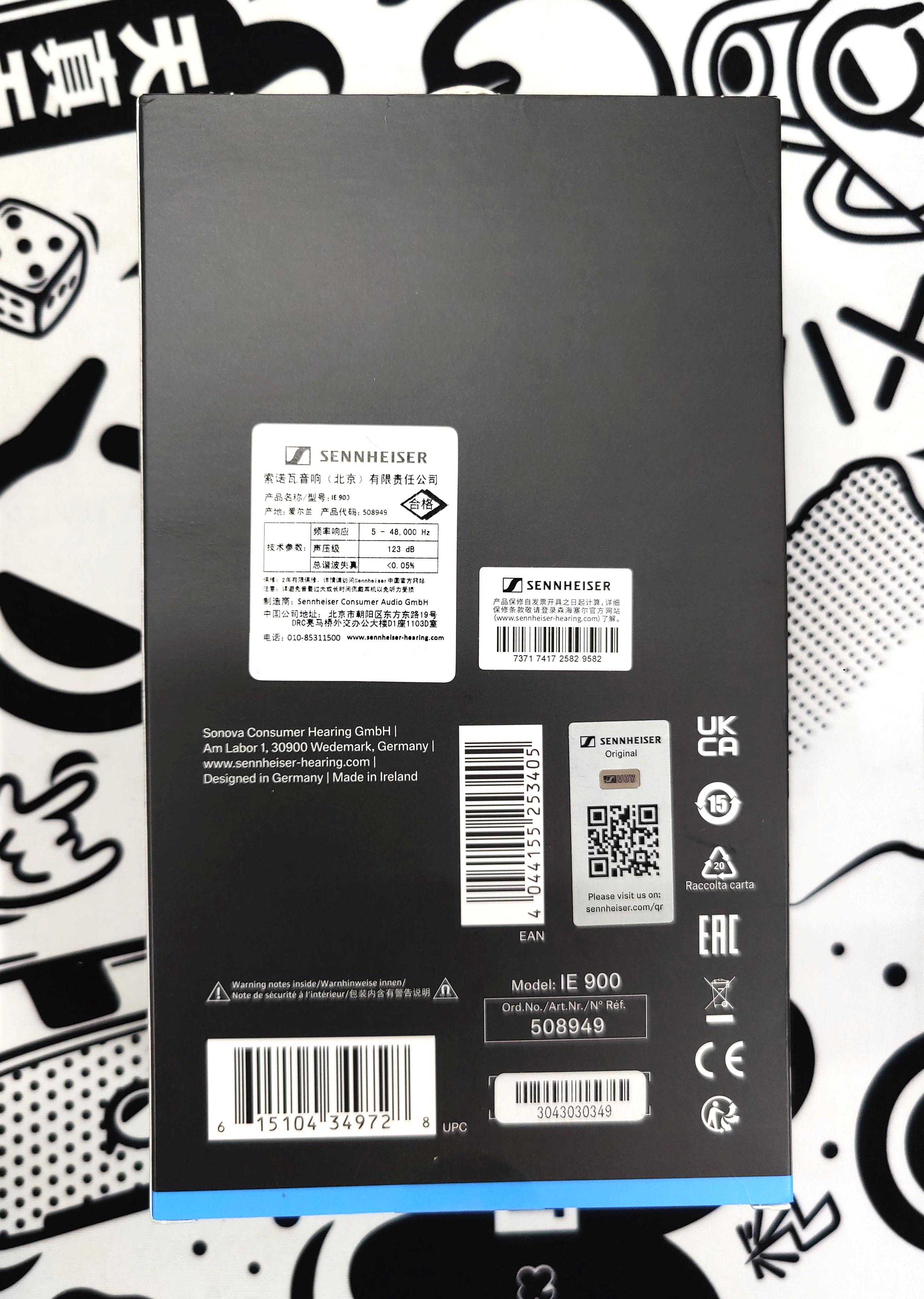 拿到这两款塞子的外包装你就可以一眼辨认出它们绝对是出师同门的兄弟俩,同样的蓝色和黑灰主色调的左下角带一个硕大的Hi-ResAudio金标的纸盒,只是在外盒正面左上角银色印刻的产品型号IE900和IE600和正面耳机腔体的特写照加以区分。不同于友商耳机包装盒背面一般都会印有具体参数,森海的这两款可谓自信低调地只是贴了张防伪标签和简单得不能再简单的印有最基本技术参数的白色贴纸。