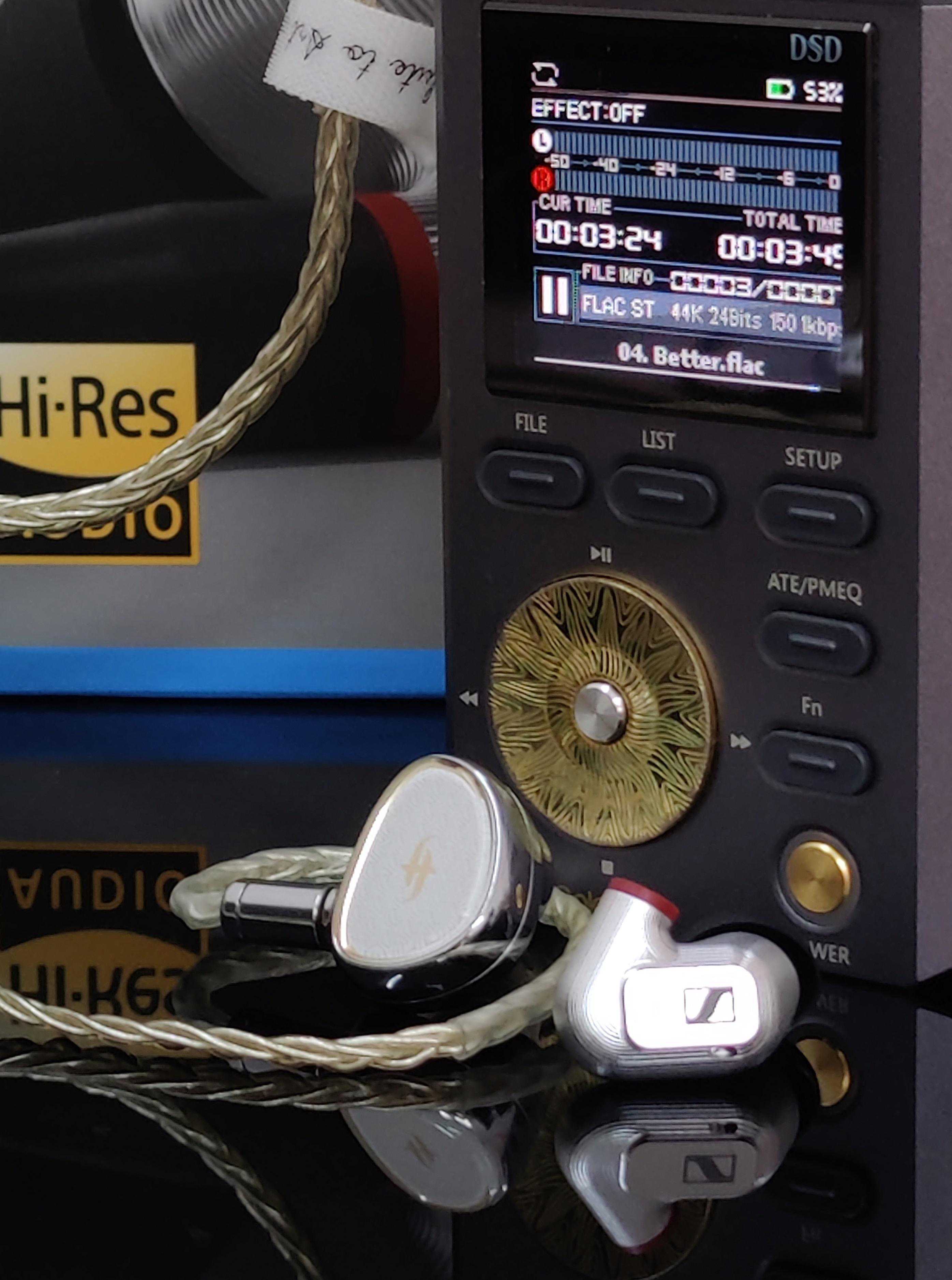 飞傲M15当转盘,搭配ifigryphon解码耳放一体机,借助强大的推力可以发挥把这两款塞子的潜力给发挥出来,通过比对:飞朵阿缇米斯基本在解码耳放一体机音量75左右即可推到非常满意的程度,音量再高就会有过推的可能性存在!相比之下,IE900在解码耳放一体机90乃至以上的音量前提下,在具体的器乐表现方面,IE900的表现更有意思一些,拥有优秀的细节和相对精准的结像位置,这些是非常类似现代森海塞尔的70%监听+30%流行综合调音风格的,高素质。但是在低频声部的部分又拥有着非常出色的量感和包围感。并且低频总有一种在崩溃边缘而又从来不会失控的位置,这种听感是非常有趣并且过瘾的。而解析、结像、透明度和低频的量感和包围感又并不冲突,可以同时得到,这可以说是目前耳塞中非常少见的了。飞朵阿缇米斯相对而言在小音量的听音环境下,显得更为讨好耳朵,因为相对IE900,她对于前端播放器和解码耳放一体机的素质要求并不像IE900那么高那么苛刻!而这时候各位烧友会问:开启ifigryphon看家本领的XBass+XSpace音效如何?我可以借此机会说:开启音效对于这两款素质极高的旗舰耳塞那是“多余”两个字!