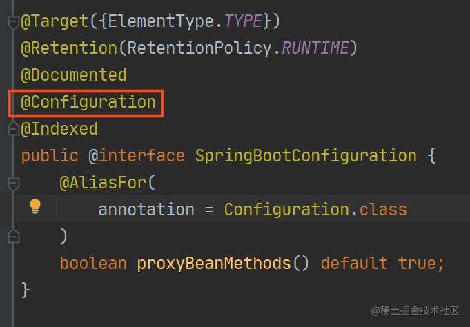 @SpringBootConfiguration注解:我们再次点进去看这个注解,其实它就是一个@Configuration注解。