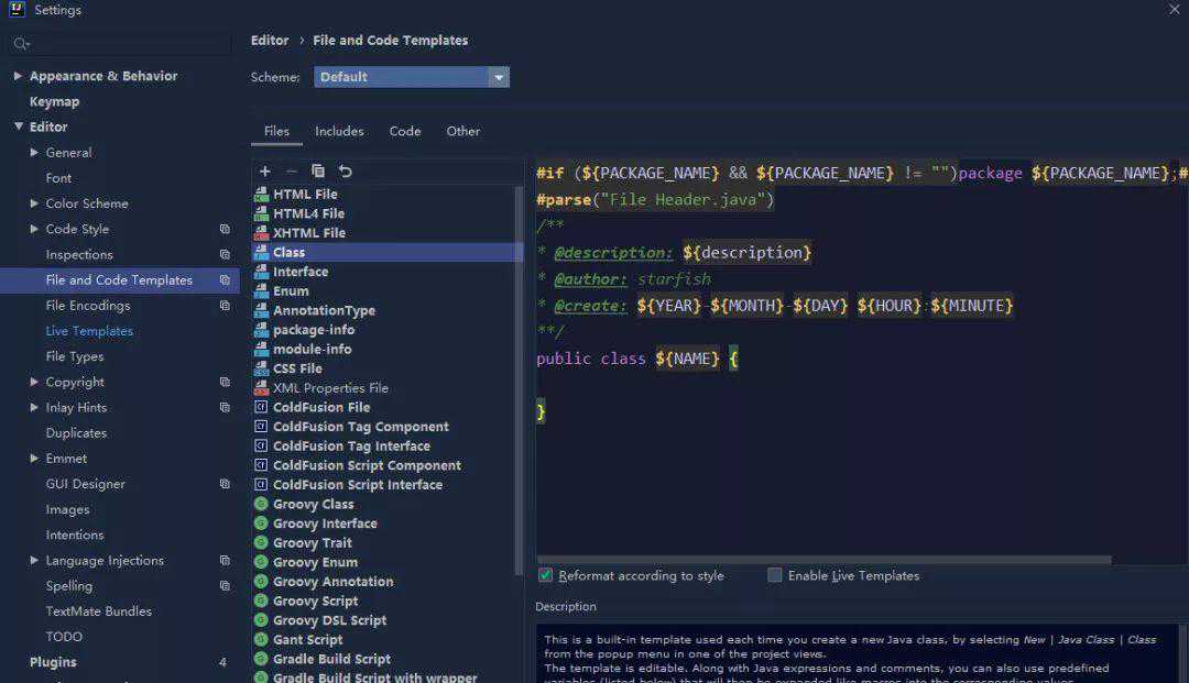 类注释一般通过File—Setting—Editor—LiveTemplates—FileandCodeTemplates设置