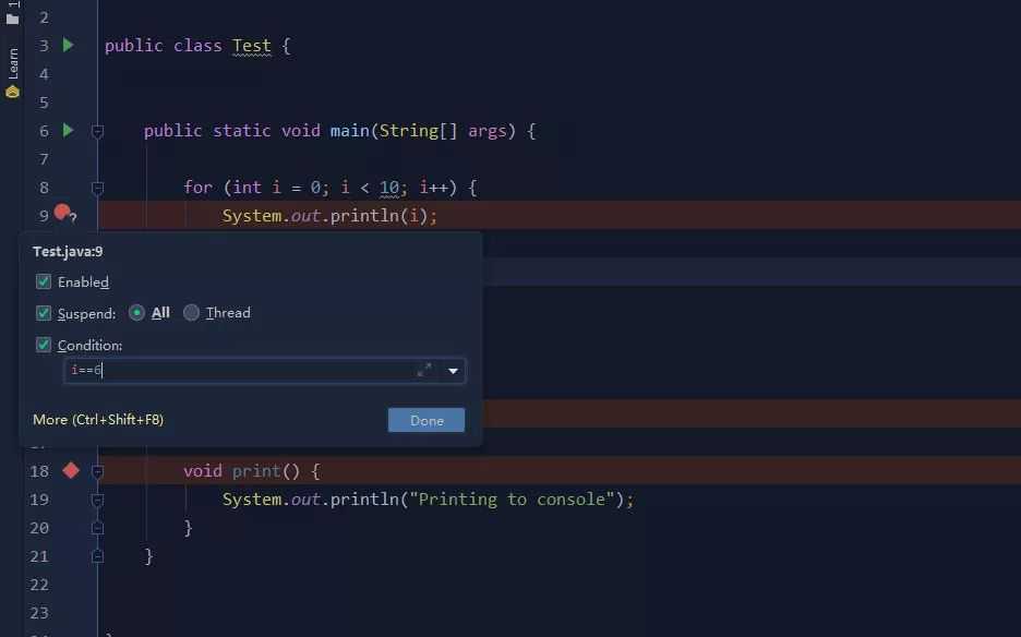 有时候我们在循环处理数据时候,可能只关心某个条件的数据,就可以在断点位置右键,设置断点条件,(下图,在i==6的时候挂起程序)