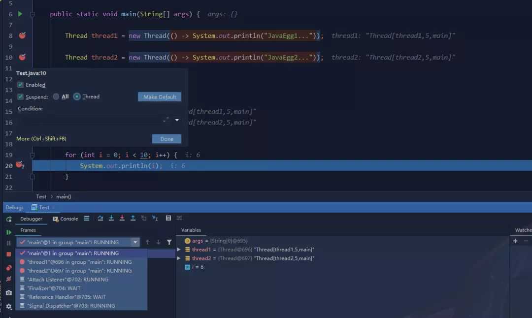 在调试多线程代码时候,只能串行调试,因为IDEA在Debug时默认阻塞级别是ALL,会阻塞其它线程,只有在当前调试线程走完时才会走其它线程。如果像下图一样是lambda表达式的行,可以选择断点类型。