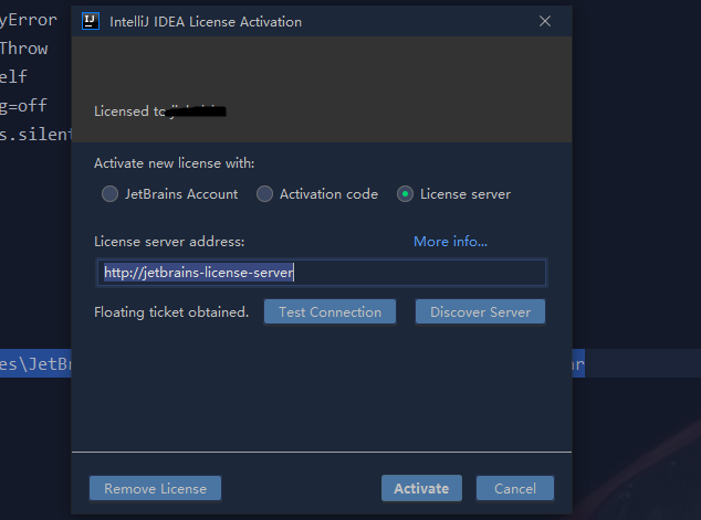 2.重启IDEA后,打开Help—Register,在LicenseServer填上,http://jetbrains-license-server,失败的话就输入下边的注册码