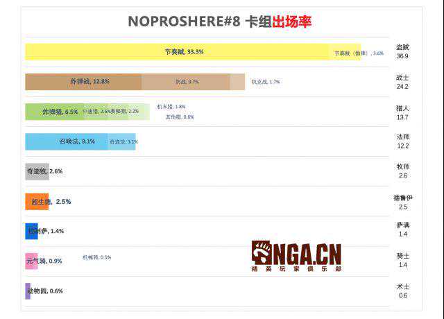 三分之一的选手都带了节奏贼(带麦拉水晶没带宿敌的版本),带诺米也成为盗贼越来越主流的选择。战士法师和猎人出现的也比较多,但就单个职业来说,并没有盗贼那么热门。