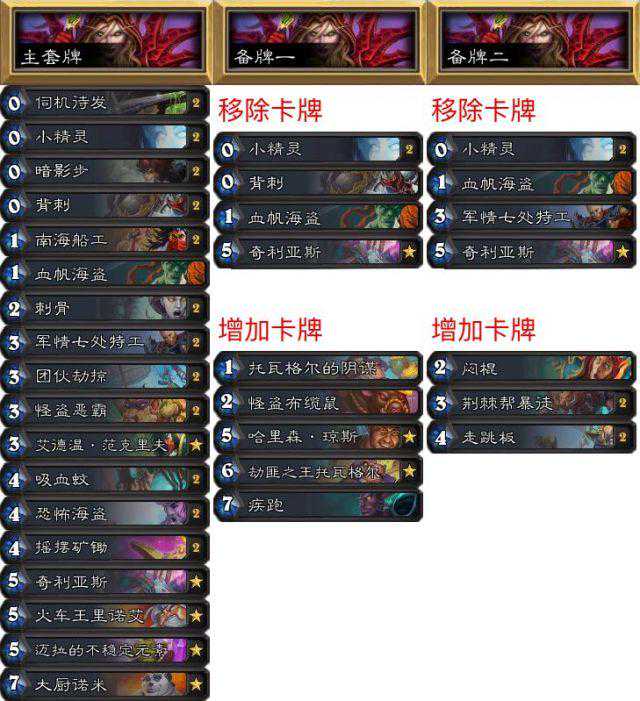第二套是要针对战士,我去掉了闷棍和奇利亚斯、背刺、血帆海盗,取而代之的是国王和阴谋牌这样的厚度牌,疾跑可以加速过牌,战士一般都处理不了3波诺米或者3-4波国王。