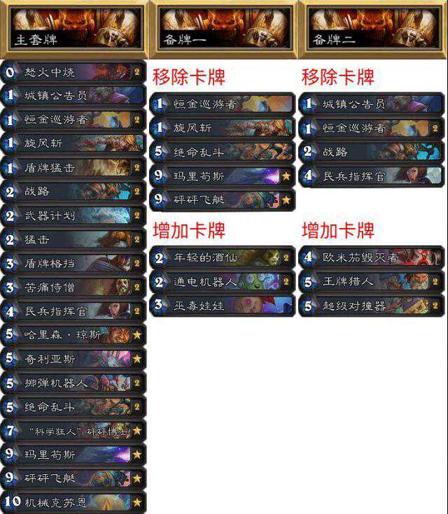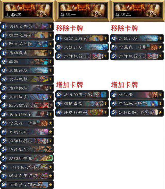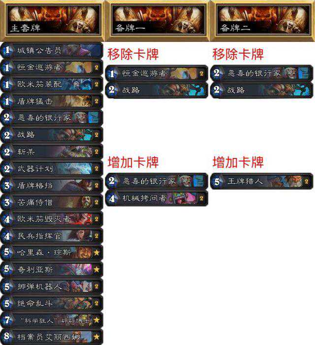 因为我的卡组很能打盗贼,所以我的策略就是要保证对法师和内战时保证胜率。我带了银行家而不是熊猫,这样内战更有优势。第一套牌可以打很多快攻,像是盗贼和猎人,仅仅只是不容易被打死,如果盗贼带了诺米,那战士还是要有一定的场面和进攻性。王牌猎人就是打法师而带的,如果到了10费就可以用欧米茄了。第三套用来内战,带了机械拷问者所以打诺米牧和元气骑也很有优势。