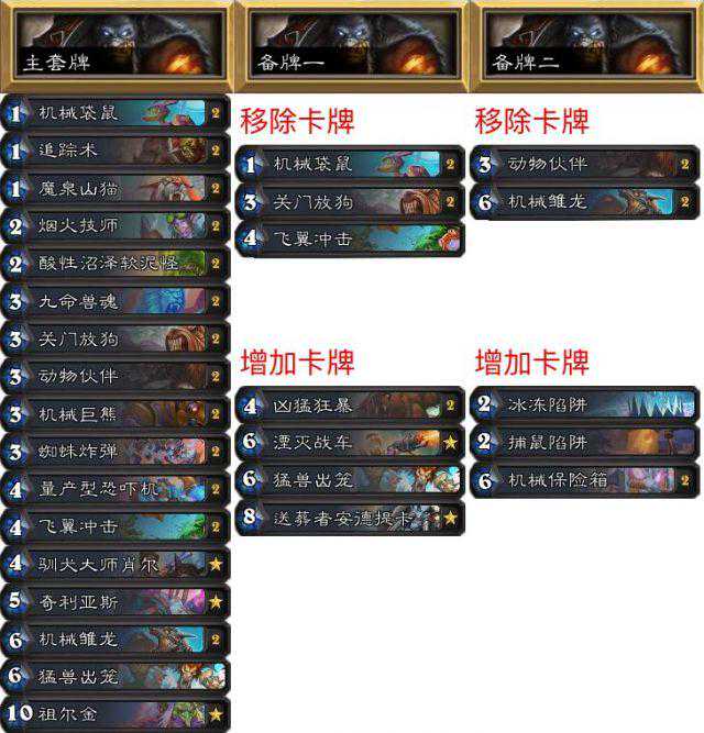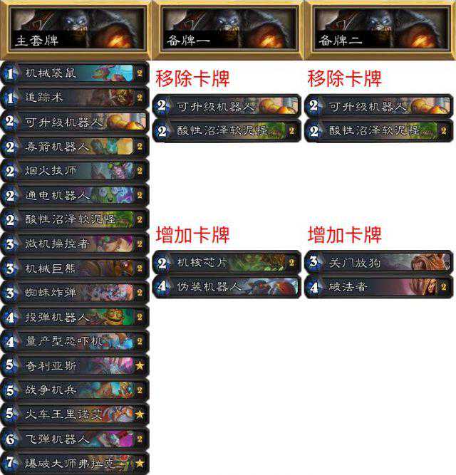 首先,这三套卡组不是我最开始的版本,我抄了SCACC打到第九名的那三套。第一套牌是打盗贼的,机械猎人很容易打战士和法师,所以盗贼很容易作为首发卡组来吃机械猎。这套牌打盗贼的比分是5:0(小分10:3)。第二套卡是打控制的(特别是战士),微机操控者使得机核芯片非常强力,机械幼龙和九命兽魂也是不错的选择,这两张卡略慢,但是提供了一个打战士的机会。炸弹战有时候会带消灭机械的随从和破法者,这种情况下,要大量铺场而不是磁力。第三套卡组在内战中表现良好,我用来打手牌龙法,但我还不确定是否可行。只有3个卡位是可以替换的,但是卡组一的每一张卡都很不错。作为备选,可以用一个青铜防御者替换一个追踪术,这样会更有机会打盗贼。