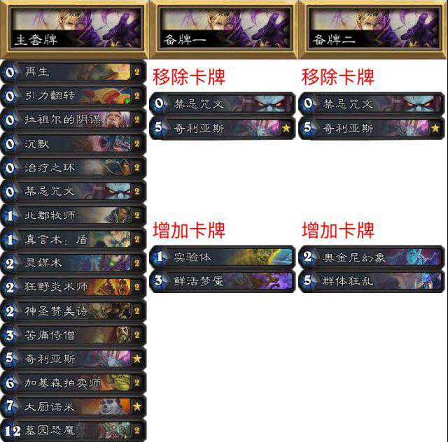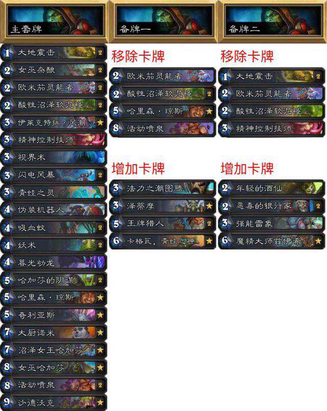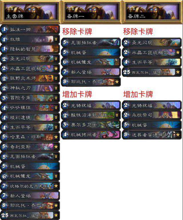 3套卡共同点:1、青蛙之灵,这样可以抽到需要的法术,所有对局我都会留,如果对面攻势太猛我可能会硬币震击。2、44潜行机器人,他们有潜行,可以站住,如果贴上奇利亚斯可就太强了,在第三套牌可能获得潜行沙德沃克。3、大厨诺米,诺米可以终结不少比赛,这样可以省一个档案管理员。4、吸血蚊,在所有对局都有用,还能增强沙德沃克。最后,我们比较在乎战吼而不是随从身材,因为随从很容易被消灭。我希望卡组能对抗战士,贼,法师和猎人,所以就得到了现在的卡组。第一套是打贼的,欧米茄灵能者可以把清场回血二合一。泽蒂摩把变青蛙和大地震击二合一,可以一次移除磁力随从或者多个巨人。青蛙之神在对阵法师时提供了多个解牌。关于第三套牌,是打战士的,这套牌没什么人用,但是真的很强,银行家和雷象联用可以得到无尽的牌库,还可以回收吸血蚊,隐形的沙德沃克,有时候也可以回收诺米。熊猫也很有用。魔晶大师可以打打机克,既然它这么泛用那带上一张会有用的。