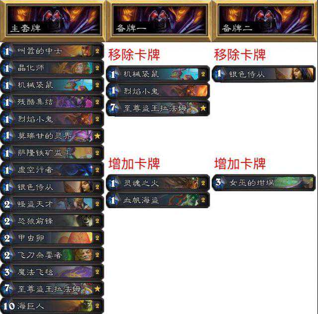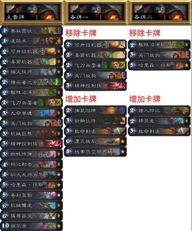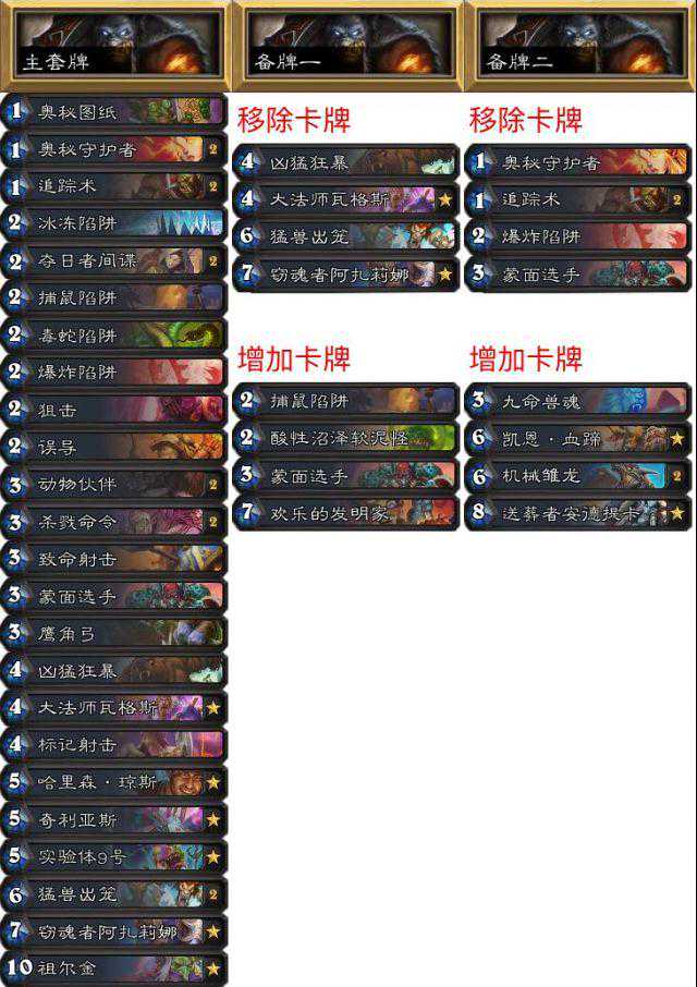 第一套牌打贼。我加了两个软和哈里森以确保及时摸到。飞刀放狗和130可以针对铺得太开的猎人以及其他快攻。第二套是打战士的,带档案管理员来弥补追踪术和哈里森过的牌,也可以移除牌库中的炸弹。第三套是打诺米牧和法师的,带了致命射击和印记。精灵龙很出其不意,它不能被选中所以很有威胁,牧师很难搞它。