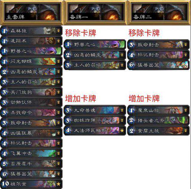 第一套牌是打盗贼和战士的,野兽不多,所以很容易抽到鳞皮兽和狂暴的组合,这是赢下大多对局的关键。第二套卡打法师,九命兽魂招炸弹,也可以招蝴蝶,大法师瓦格斯对于法师来说比较难解,配合致命射击很强。第三套卡组有土狼,对抗德鲁伊和动物园会很有机会,有时候也可以打打机械猎,老实说我用这套卡是因为我在这边服务器上没有什么卡,而玩最厉害的卡组也挺没意思的。