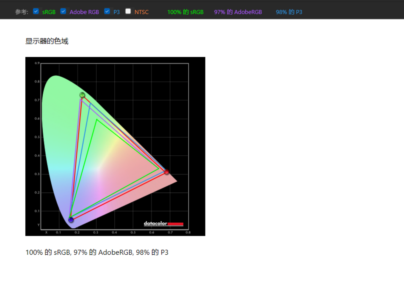 校色仪实际测试原生模式下覆盖100%sRGB色域、97%AdobeRGB,98%的P3与官方标称基本一致。