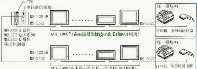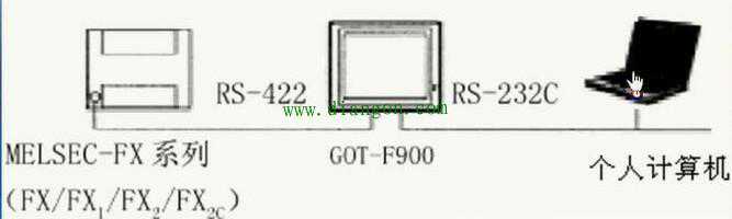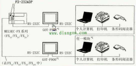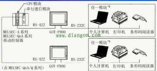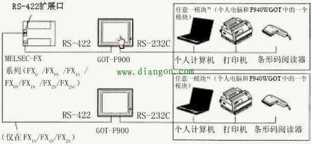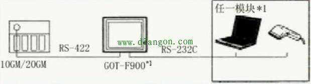 F900GOT(F920GOT-K除外)可以直接与FX定位模块(10GM/20GM)的编程口RS422相连,通过GOT的RS232C接口,可以和个人计算机、打印机或条码阅读器相连。