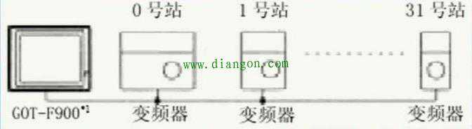 F900GOT(F920GOT-K除外)和FREQROL系列变频器内置的PU端口相连,一台F900GOT最多可连接10台变频器。