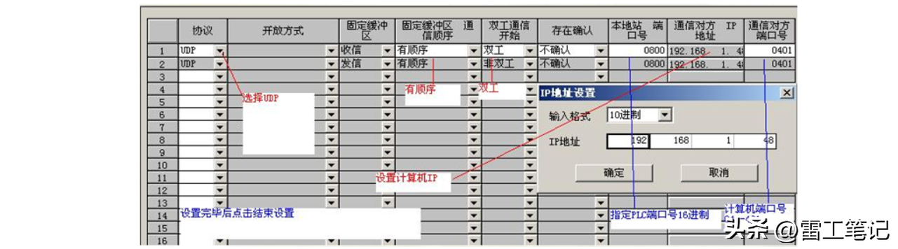 1、整个网络的PC和PLC,部分要相同,ddd和PLCport,ComputerPort部分不要重复。如本例设置的:192.168.0.3:2000:4000:3:1。