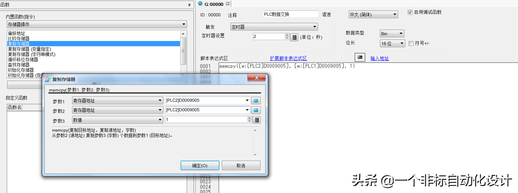 就是利用复制存储器操作,把PLC1的D9005数据复制到PLC2的D9005里面,间隔2S