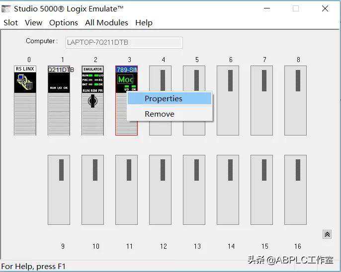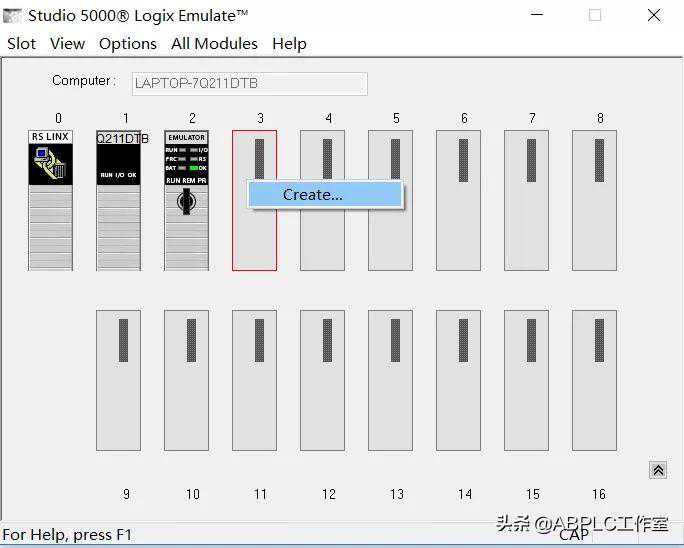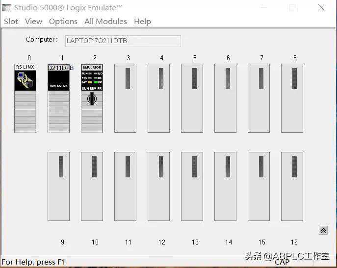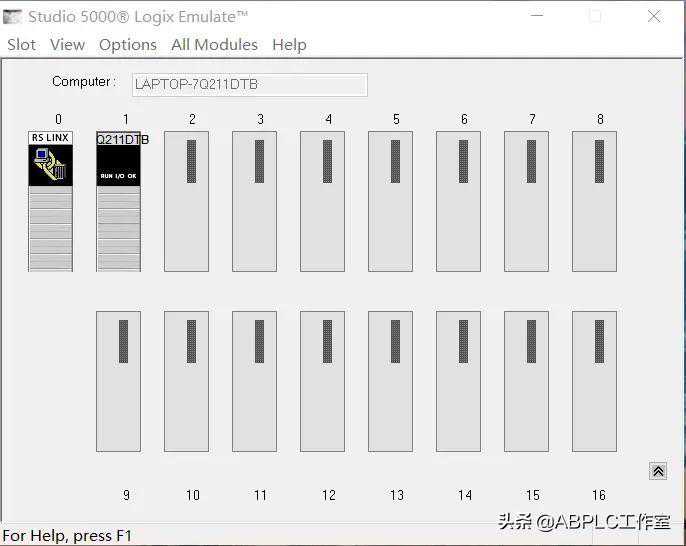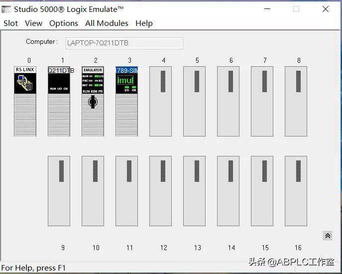 1.打开Emulatev30仿真软件,默认的界面如下图,0号槽为RSLINX,1号槽为计算机,这两个槽默认被占用,不能删除,其作用是用RSLINX把计算机和仿真器连接,模拟实体PLC.