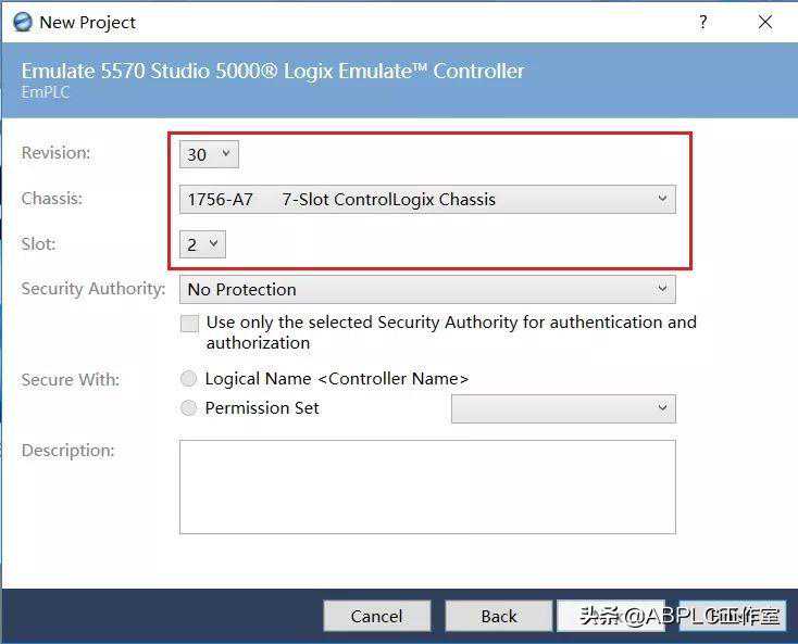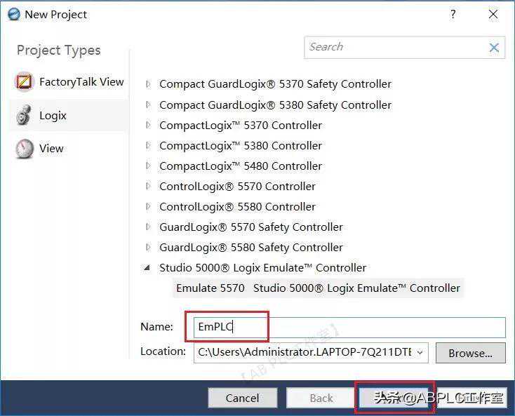 1.打开Studio5000编程软件,选择Emulate5570Controller,填写Name,点Next.
