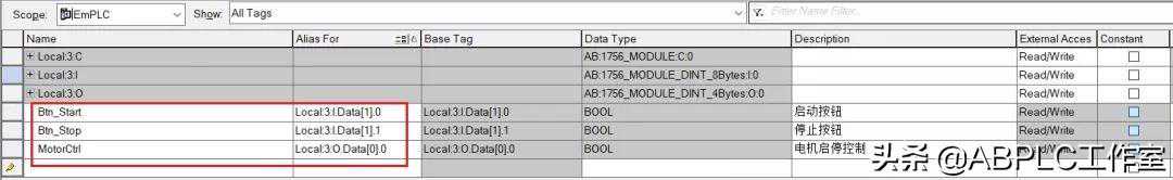 7.在控制器标签里建立2个DI点(Btn_Start,Btn_Stop),1个DO点(MotorCtrl),此次用到别名标签,指向的仿真IO模块的点位.