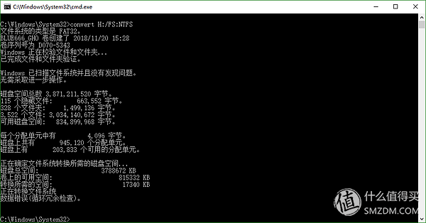 ▼输入命令:CONVERTH:/FS:NTFS,按确认键,就开始执行转换过程。