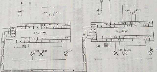 控制步骤如下:首先用两台FX2N型号的PLC通过RS485通信模块连接成一个N:N型网络结构。然后按下主机的按钮SB01后,与从机连接的指示灯HL11点亮;松开SB01,HL11熄灭;按下从机的按钮SB11后,与主机连接的指示灯HL01点亮;松开SB11,HL01熄灭',我们把主机中数据寄存器D100(K10)作为从机计数器C1的计数初值。主机的按钮SB02为从机C1的复位按钮,从机按钮SB12为C1的计数信号输入,当按钮SB12输入10次时,C1的输出触点控制主机上的HL02点亮。当主机检测到没有同从机建立好通信时,HL03指示灯亮;从机没有检测到与主机建立好通信时,HL3指示灯亮。
