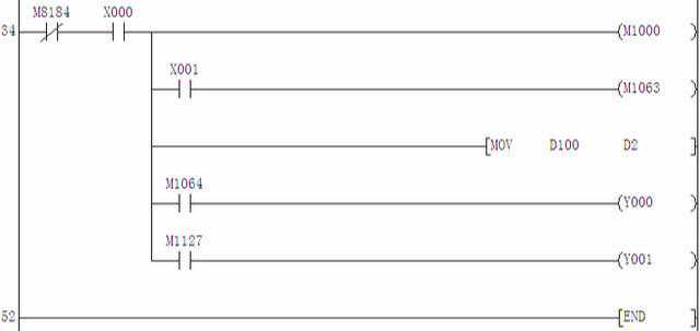 主站分配的64个内部继电器位元件是M1000至M1063,8个数据寄存器是D0-D7。将按钮SB01,SB02的状态送M1000和M1063,将D100中的数据送D2中,1从站的M1064和M1127就能取得SB11和计数器C1辅助触点的状态,分别送Y0、Y1输出。主站控制程序如下图。