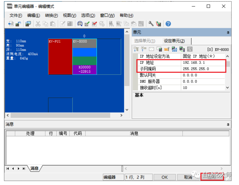 4.在[设定单元(2)]标签中,设置KV-8000的IP地址和子网掩码。IP地址:192.168.3.1子网掩码:255.255.255.0(默认)