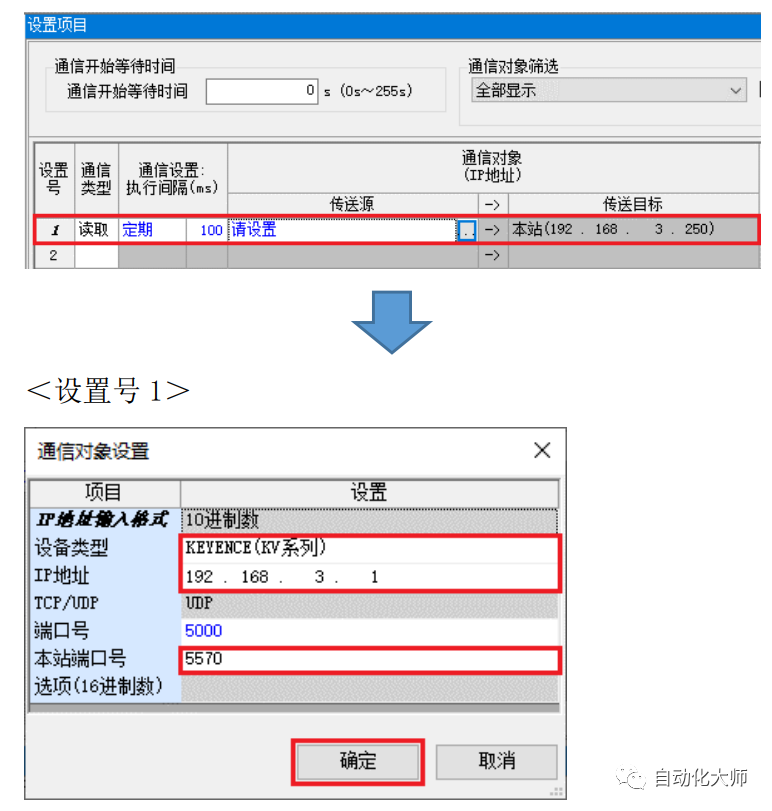 在通信对象设置画面按下述内容进行设置。设备类型:KEYENCE(KV系列)IP地址:192.168.3.1本站端口号:5570