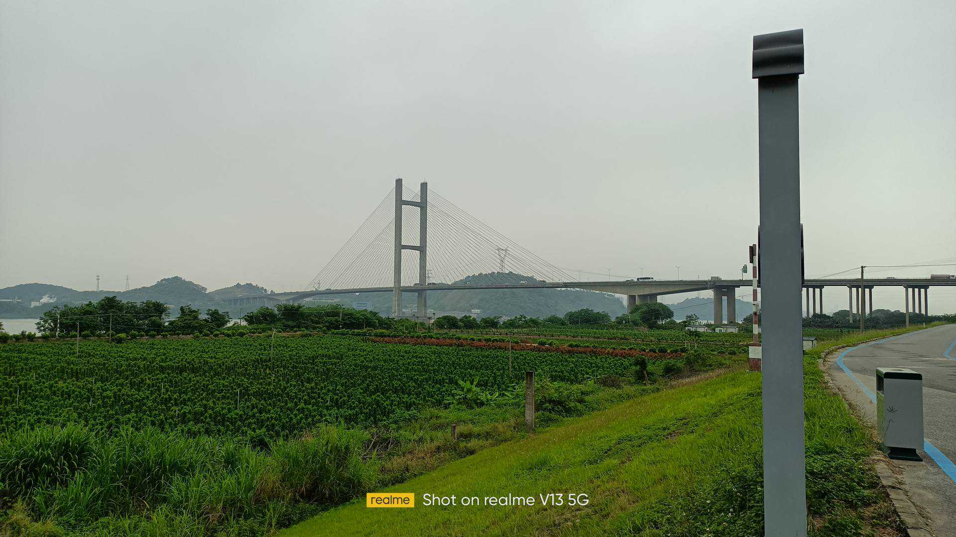 这张是阴天拍摄的,天气比较灰暗,realme真我V13的白平衡较为准确,远处的桥梁铁索都很清晰地展现出来,整体画面层次和锐度都表现不出,但放大细节后,图像的颗粒感还是存在的。