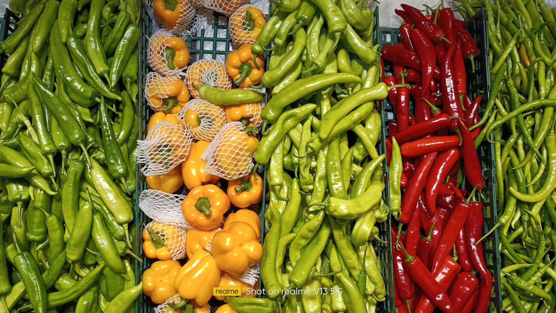 色彩的表现方面,在室内拍摄这张蔬菜照片,一方面要控制好环境灯对被拍物的影像,另一方面也要考虑同色之间的交错问题,realme真我V13拍摄色彩确实符合这个价位的水准,被拍物个体颜色深浅过度有层次,轮廓也清晰。